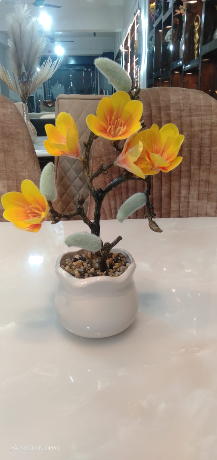 This beautiful artificial flower plant brings a touch of nature’s charm into any interior space without the hassle of maintenance. Set in a white ceramic pot, the plant showcases a cluster of intricately designed leaves and flower giving it a realistic and fresh appearance. Ideal for enhancing your living room, office desk, or reception area, this artificial plant adds a splash of greenery while complementing modern decor. Made from durable materials, it remains vibrant and lush all year round, making it a hassle-free and long-lasting decorative piece.