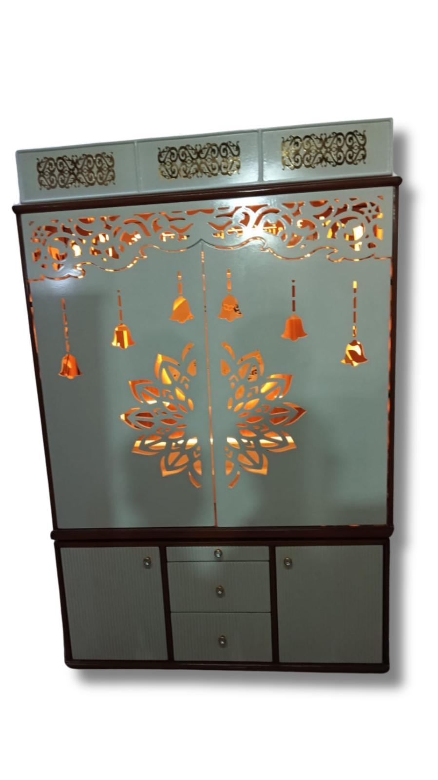 This elegant mandir combines traditional design with modern utility—perfect for creating a peaceful corner for prayer, reflection, and positive energy in your home.