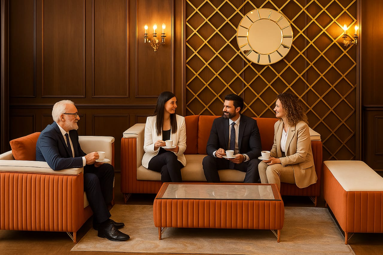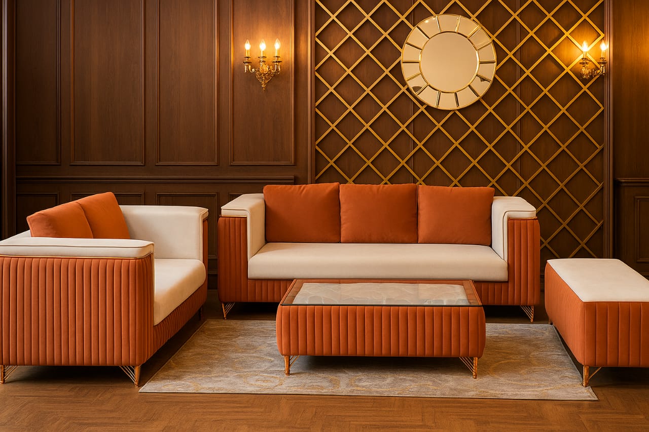 A harmonious mix of art deco flair and contemporary form, this set features premium velvet upholstery with bold vertical fluting on the sides and base. The contrasting cushions in burnt orange complement the warm wood-panelled backdrop, offering a perfect blend of modern and classic aesthetics. Gold-tipped legs and elegant symmetry enhance its upscale charm.
